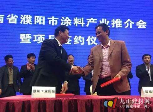 周伟建董事长作为签约代表致辞。濮阳市人民政府市长宋殿宇、濮阳市政协副主席贾太杰、濮阳市政协副主席李莉荣、濮阳市人民政府副秘书长段升显、广东省涂料协会秘书长吕水列、广东顺德涂料商会会长胡景钊、濮阳市商务局长康合斌、濮阳市驻深办主任肖静玉、濮阳工业园区管委会主任刘普军、濮阳政协经济委副主任刘世献、濮阳市商务局副局长运壮志、濮阳市工业区管委会副主任韩占府等领导出席会议。