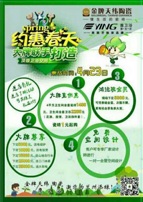 每日甘肃网讯 “进店有礼,进店了解活动可获赠精美礼品”、“瓷砖1元起购”。这是促销吗?近日,记者实地踏访位于兰州高新区的红星美凯龙世博家居广场,了解金牌天纬陶瓷旗舰店和鹰卫浴品牌专卖店发出的海报。600多平方米的店面,干净整洁,业务人员忙前忙后,正在为4月23日开启的大牌联手打造“约惠春天,为兰州添绿”大型促销活动布置会场。