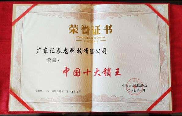 “中国十大锁王”、“中国智能锁知名品牌”的评选,历经层层选拔,要求严格,考核质量指标和市场占有率指标,产品质量要处于国内领先地位,市场占有率、品牌知名度、产品开发能力等居锁具行业前列,能获选“中国十大锁王”和“中国智能锁知名品牌”,是对汇泰龙在锁具行业的影响力、锁具产品的综合实力的绝对认可。