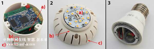 灯泡底套管主机电源(1c)、光传感器(2 b)、VLC控制板(1a)和Qualcomm SoC板; (2)套管顶部外壳LED散热器(2b)和LED(2a),进一步提供额外的空气流(2 c); (3)原灯泡发光二极管和集成的电源插座。