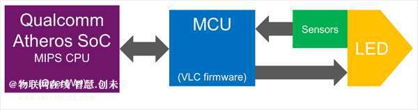 主要的计算模块将基于MIPS的Qualcomm Atheros SoC和内置802.11 g / n Wi-Fi、20 GPIO引脚及UART端口集成在一起。此SoC已使用在很多电子爱好者的方案及运行OpenWrt的机器人应用程序中——智能灯泡也不例外。OpenWrt是嵌入式Linux的发行版,用于优化网络设备和附带完整Wi-Fi堆栈的产品,其可提供一个完整的VLC传输层。