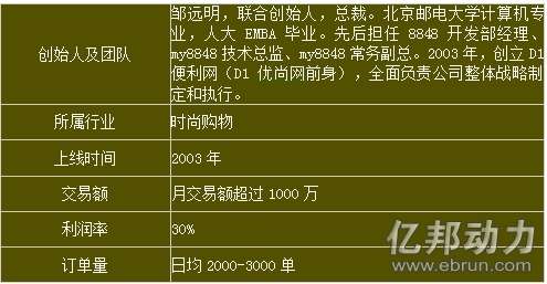 D1优尚网成立于2003年,是知名时尚B2C网站,主要经营服装、化妆品、饰品、家居等商品。目前,D1优尚网的月销售额超1000万元。