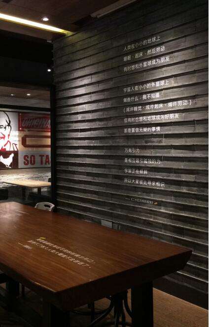 此次肯德基与大吐司的跨界合作打造的读书主题餐厅也是别具一格,在这里,顾客可以感受到被“书摘”包围的用餐体验。长长短短的诗歌、段落、词句,巧妙的布置在餐厅的各个位置,也许在某一张餐桌上你看到“我的灵魂里有很多地方玩世不恭”;转头在墙面上发现一句“我还年轻,我渴望上路”;甚至在洗手台前偶尔抬头,也会在镜子上遇见“一辈子太长,要找个有趣的人在一起”。这些颇有玩味句子都摘自于经典的小说或诗歌,每一次不经意的遇到,对心灵都是一次触碰和洗礼。