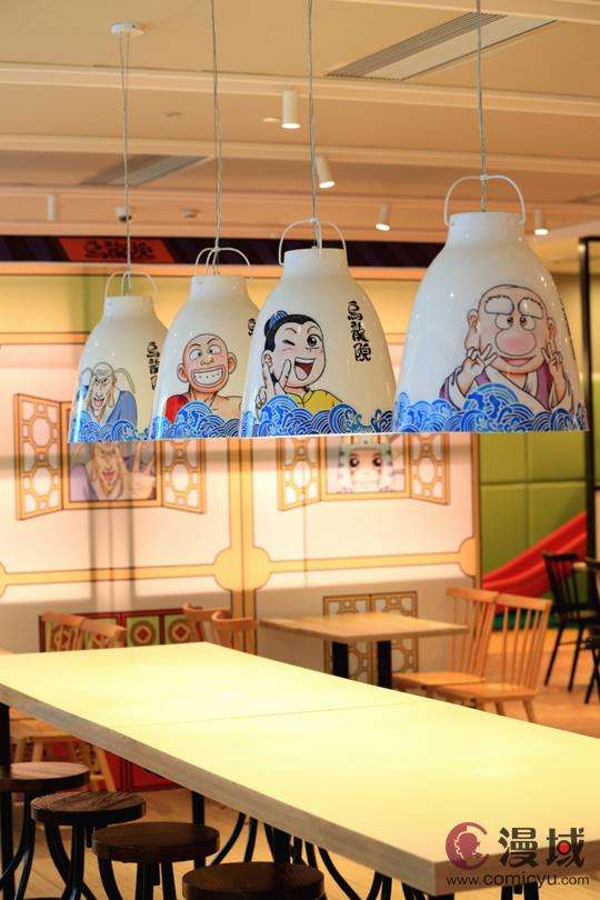 “餐厅一整面风景玻璃都是半透明的乌龙院漫画场景,从外面看,餐厅里的人就好像真实的生活在乌龙院里一样,这种感觉真的太棒了!”这位90后的国漫迷王睿看起来竟有点激动,“我小学的时候就爱看《乌龙院》,里面那个大师兄最搞笑了,是我童年的最大乐趣!”