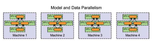 当然,这些方法并不是完全互斥的。假设有一个多GPU集群系统。我们可以在同一台机器上采用模型并行化(在GPU之间切分模型),在机器之间采用数据并行化。