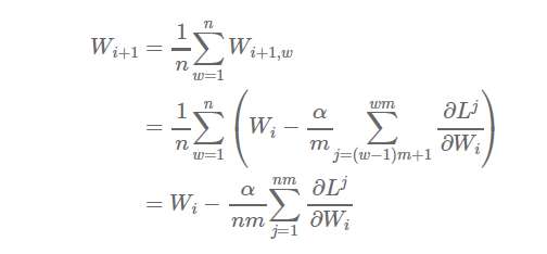 事实上,很容易证明参数平均法的结果在数学意义上等同于用单个机器进行训练;每个工作节点处理的数据量是相等的。数学的证明过程如下。