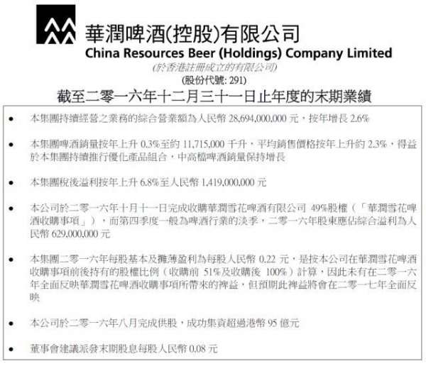 据年报,华润啤酒于2016年10月11日完成收购华润雪花啤酒有限公司49%股权,而第四季度一般为啤酒行业的淡季,公司股东应占综合溢利按年减少5.7%至约人民币6.29亿元。收购49%股权所带来的裨益预期将会在2017年全面反映。