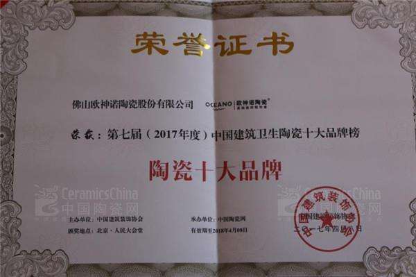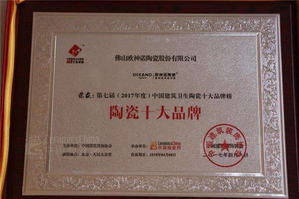 \u00A0 \u00A0 欧神诺陶瓷作为“陶瓷十大品牌”的参评企业,经过热度高企的网络投票和专家评审团的严格审核,最终高票问鼎行业最高荣誉“2017陶瓷十大品牌”。欧神诺陶瓷负责人受大会邀请出席本次盛典,并上台接受颁奖仪式,一同入选“2017陶瓷十大品牌”的企业品牌还包括马可波罗瓷砖、东鹏瓷砖、强辉陶瓷、百特陶瓷、能强陶瓷、金舵瓷砖、冠星王陶瓷、狮王陶瓷、金尊玉大理石瓷砖。