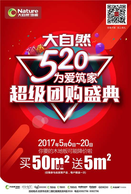 据悉,作为冠军联盟的主要成员之一——大自然地板率先发表“大自然520为爱筑家超级团购盛典”精彩预告,活动时间为5月6日~20日,这次活动为消费者准备了四重好礼,一、爱家有礼,领抵用券;二、健康精品,特惠升级;三、喜买乐送,买地板送地板;四、联单升级,抽奖豪礼;活动期间,交定现金每满2000元的客户,即可获得参与全国统一抽奖机会一次,满4000元即可抽奖两次,以此类推,惊喜不断。