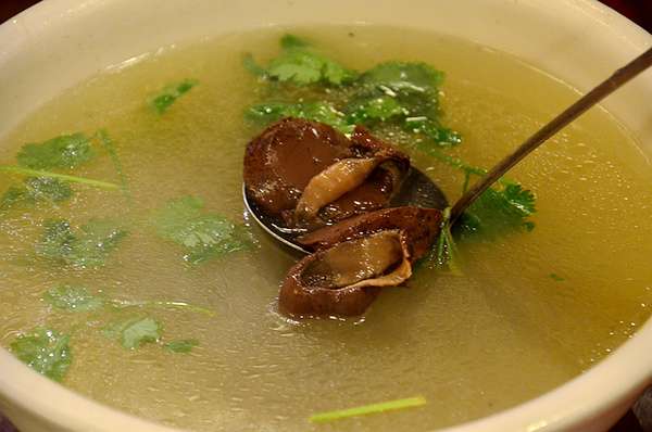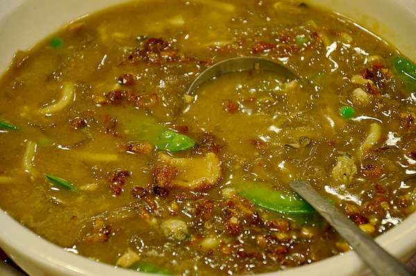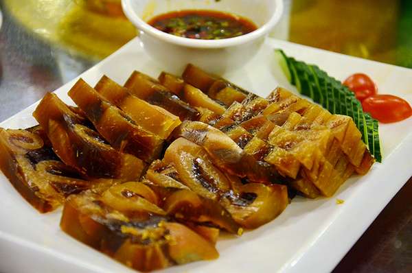 大肠猪血汤,类似同安著名的大肠血,在猪大肠中灌入猪血后做汤,鲜美够味。