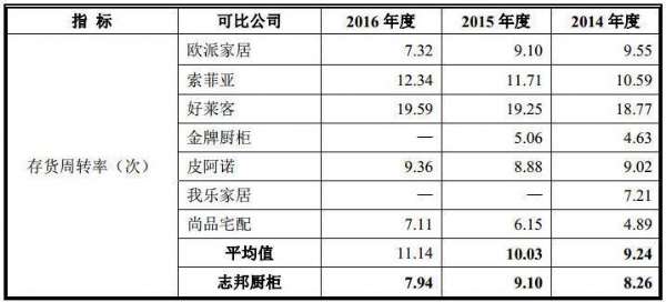 除应收账款外,志邦橱柜的存货也呈增长趋势。数据显示,公司2014-2016年末存货余额分别为7082.9万元、8312万元和1.58亿元,存货周转率分别为8.26次、9.10次、7.94次;同期可比公司存货周转率的平均值分别为9.24次、10.03次、11.14次。