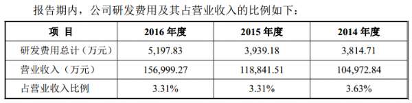 与此同时,志邦橱柜在研发方面近年来也逐渐加大投入。招股书显示, 2014-2016年,志邦橱柜研发费用分别为3814.71万元、3939.18万元、5197.83万元,占营业收入的比例分别为3.63%、3.31%、3.31%。
