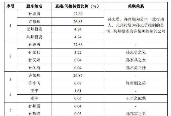 据志邦厨柜招股书披露,公司股东中孙家兵为孙志勇之兄,持股比例为3.22%;孙又婷为孙家兵之女,持股占比0.04%;孙冬梅为孙志勇之妹,持股占比0.04%;许小飞为许帮顺之弟,持有志邦厨柜0.03%的股份。公司股权呈现明显家族式结构。