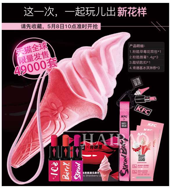 当所有人都觉得粉色是甜美,玛丽黛佳不墨守成规,用实际行动表示粉色也可以扮酷。玛丽黛佳X肯德基遇见“莓”好唇膏礼盒,让你颜值爆表:冰淇淋造型包,随时随地凹造型,刷屏朋友圈;一串炫色钥匙扣,为你的造型加分,3个mini轻雾感唇膏,让你嘴巴从此寂寞;3个肯德基冰淇淋券,让味蕾酷爽不断。