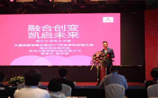 久盛地板国内优秀供应商代表——苏州力维董事长杨学锋先生在会议上发言。他将自己与久盛的合作娓娓道来,从小到大,茁壮成长,赞誉久盛在行业起到了良好的示范和带动作用,感激久盛对合作伙伴的关心、帮助和支持。同时决心优化管理、完善服务、持续提升竞争力,继续与久盛精诚合作、共谋盛业。