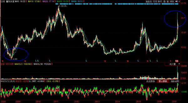 在2017年,海螺水泥又迎来高位减持冀东水泥的好时机。在近期雄安概念股的爆炒下,水泥板块的股票飙升,一度表现十分强劲。而冀东水泥也备受关注,曾经有过6个“一”字涨停。
