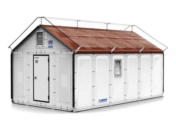 这款避难所只需要 5 个人花费 4 小时即可完成组装,占地面积 17.5 平方米,使用了塑料面板和金属框架搭建,可更好地抵御雨水与洪水,官方宣称至少可用三年。