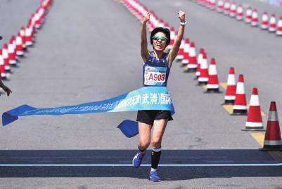 4月29日,山东选手运艳桥冲过终点后庆祝。他成为全运会历史上首个群众金牌获得者。4月29日,山东淄博选手唐辉冲过终点。本报4月29日讯(记者 王蓓贝)第十三届全运会马拉松比赛今天在天津武清鸣枪开跑。在首次设立的群众组比赛中,山东选手运艳桥获男子组冠军,同时也成为全运会历史上首次设立的群众金牌获得者。同为山东选手的唐辉获马拉松比赛群众组女子冠军。为贯彻“全运惠民健康中国”的主题,设置群众项目、允许普通群众参赛是本届全运会最大的特色和创新。今天进行的群众组马拉松比赛是本届全运会19个群众比赛项目中的一项。在30摄氏度的烈日下,共有来自全国31个省、自治区、直辖市的4128人参赛。