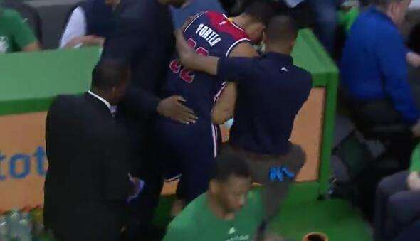 随后比赛进行到第三节7分47秒时,凯尔特人继续发起进攻,托马斯跑动,波特上前防守,托马斯跑动用头直接撞到波特鼻子上,随后镜头中可以看到波特马上就捂住自己的鼻子,但是血已经大量的流出,止都止不住。比赛紧急暂停,波特迅速回到更衣室治疗。托马斯也来到奇才队这边试图解释,引起莫里斯的强烈不满。不过经过治疗之后,波特又重新回到的比赛现场。