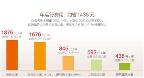 从图中可以看到,空气能热水器由于制热效率最高,一年下来电费开支大约为440元。而电热水器则需要1500元以上的开销。鲜明的数字对比,无疑证明了空气能热水器的节能并非“浪得虚名。”