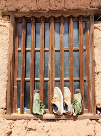 窗户上晒着夫妻俩的鞋子,甚是甜蜜。