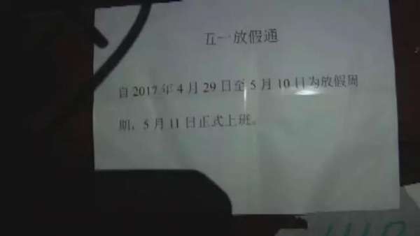 隔壁公司的工作人员说,这个房间其实很小,康洁那么大的店怎么可能租这么小的房间。此外,记者看到,在大门上贴着自2017年4月29日至5月10日为放假周,5月11日正式上班。