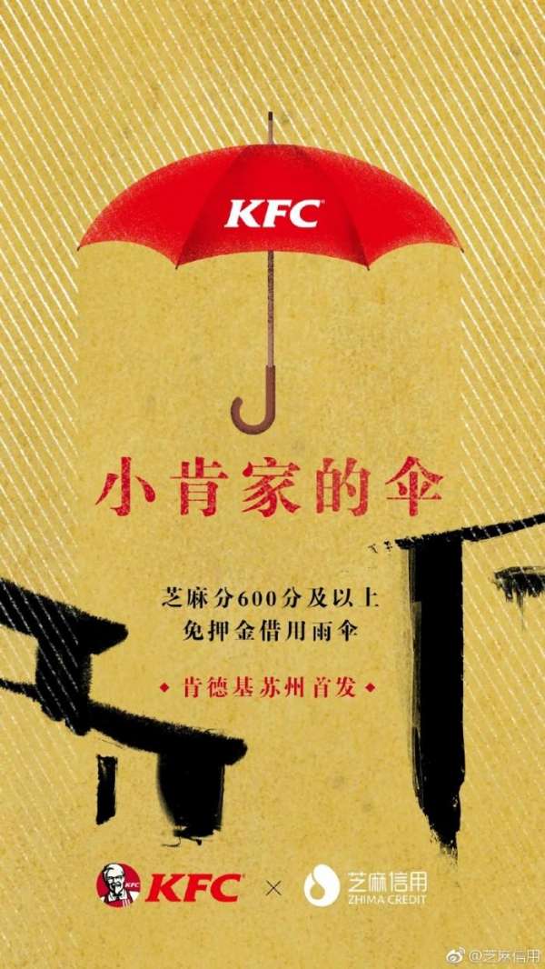(原标题:芝麻分600分以上又一福利:可到肯德基免费借伞)