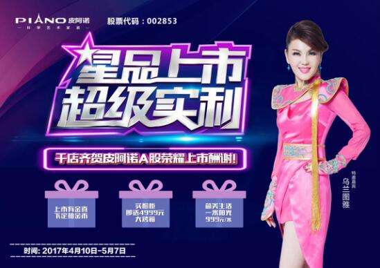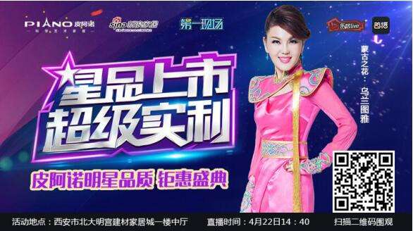 4月22日14:40,西安市北大明宫建材家居城一楼中厅,皮阿诺将邀请“蒙古族之花”乌兰图雅倾情献唱,乌兰图雅敢于创新,无论是她的音乐还是她的个人形象,都十分讲究在传承与突破两者之间探索尝试,作为融合各种文化和风格的皮阿诺橱柜、衣柜正好符合这样的定位。乌兰图雅为大家带来精彩节目的同时分享居家生活的经验,为广大市民挑选家居产品出谋划策,为幸福生活助力,皮阿诺橱柜、衣柜、家居定制五一放价、明星分享高品质生活经验、多重互动惊喜,只等广大市民和粉丝前来体验。