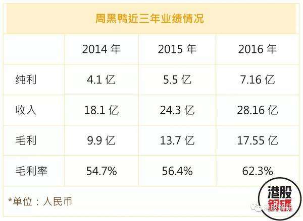 周黑鸭2016年纯利达7.16亿元,按年增长29.5%,营业额按年增长15.81%至28.16亿元,毛利达17.55亿元,按年增长27.85%,毛利率较2015年增长5.9个百分点至62.3%。从2015年的数据比较而言,周黑鸭市场份额达6.8%,绝味、煌上煌则分别达7.4%和3.4%,虽然绝味具有更广泛的店面铺设,但单店盈利却不敌周黑鸭,绝味总收入29.2亿元,净利润3亿元,门店数量7172家,周黑鸭门店数量仅641家,不到绝味的十分之一,但其同期净利润却高达5.5亿元,是绝味的1.8倍,同时,周黑鸭的毛利较绝味多出近10亿元,近三年毛利率为绝味的近一倍,这主要归功于周黑鸭以直营模式为主,加盟店较少,有助提高利润率。