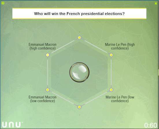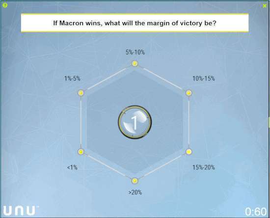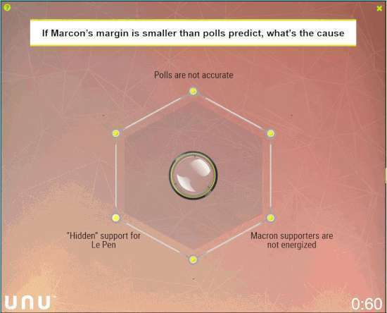 虽然调查结果显示马克龙最终将赢得大选,但是很多人把勒庞的崛起,与特朗普的反转胜利联系起来,有些人甚至称勒庞为“法国的特朗普”。有了前车之鉴,当马克龙的得票率领先勒庞18%的时候,Unanimous A.I.的研究人员希望这个群体能够预测,为什么马克龙的优势在上周日的时候可能比民调预测的优势要小。