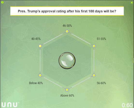 而且为了一雪前耻,在今年1月特朗普正式上台之前,Unanimous A.I.就对特朗普上任百日之后的支持率进行了预测。当时Swarm AI预测的结果是42%(如下图所示),要知道两位前美国总统的百日支持率分别是58%和61%,42%在当时看起来低得不可思议。然而“Washington Post-ABC News”4月份发布的民调结果显示,特朗普的的支持率正好为42%。