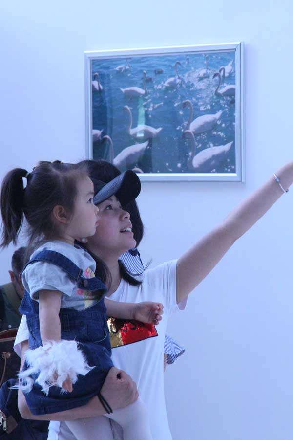 “小天鹅成长课堂”开始前家长和孩子一起看天鹅主题摄影展