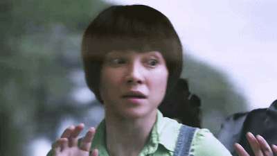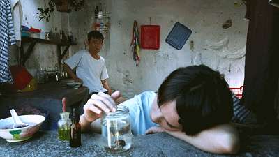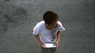 人摔倒了,但是手里依然举着红豆冰,衣服破了洞,手上流了血,终于把早已化成水的红豆冰送到打架鱼手里。没有什么的多的话,只有三个字“给你的”。