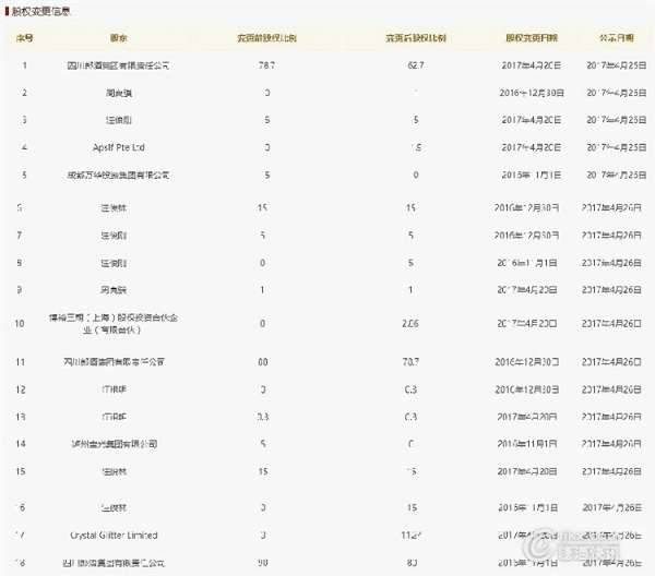 据国家工商总局企业信息查询网站显示,郎酒股份公司的股权结构在4月底已经发生变更。现公司注册资本上升到5亿元人民币,企业类型变更成股份有限公司(中外合资、未上市),最新核准日期为今年4月28日。其中,三家投资者成为郎酒股份公司股东。Apsif Pte Ltd、Crystal Glitter Limited分别持有郎酒股份公司1.9%、11.24%的股权,博裕三期(上海)股权投资合伙企业(有限合伙)持有郎酒2.86%的股权。上述三家机构通过此轮战略投资,合计获得郎酒16%的股权。