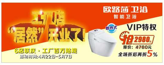 欧路莎卫浴6店联庆即将火热开业,装修的准业主朋友们,千万别错过难得的开业巨惠,早订早划算!