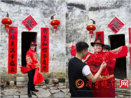 齐鲁晚报讯 不知道各位还记得这位叫做爱德华的英国小伙儿吗?5月5日,在江西省婺源县思溪村修旧如旧的“婚房”里,第一次穿上中式喜服的他掀起了中国新娘的红盖头。