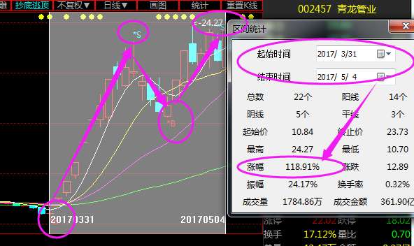 第二只用“三步抓涨曲”抓出的青龙管业(002457)4月24日再次讲解,该股自进场开盘后快速突破5日线封板成功,截止26日,连续斩获2个强势封涨停,短短2个交易日24个点的涨幅到手,从3月31号第一次讲解,截止目前已经涨幅118%。