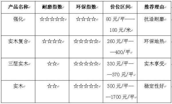 强化地板:强化地板因其价格低(80元/平米――180元/平米区间),花色多的有点被广大消费者所喜爱。12mm的厚度适中,脚感较为舒适,6000转以上的耐磨指数可以说是耐磨抗造的首选产品。