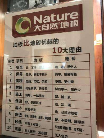 实木复合:大自然实木复合地板的卖点是地热和婴儿房首选,但从卖点中就可以感受到该款地板产品的稳定性以及环保型。九层正版无断裂基材,保证了产品的稳定性,粘合剂采用了天然大豆胶,可以食用的物体形成胶状,环保指数没得说。该系列产品采用了八遍底漆三遍面漆,耐磨和抗造指数相对较高。15mm的厚度,价格在260元/平米――400/平米。