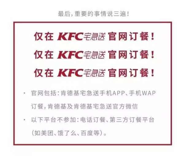 3)仅限在肯德基宅急送官网、肯德基宅急送APP订购产品时使用(电话订餐、第三方平台订餐不参加),具体情况以肯德基宅急送官方网站或APP公示为准。