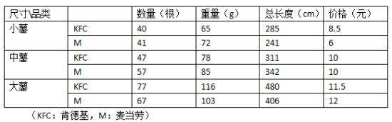 薯条方面,网友“北京吃货小分队”2016年7月针对肯德基和麦当劳的薯条“良心”程度做了一个实验,实验结果统计如下:
