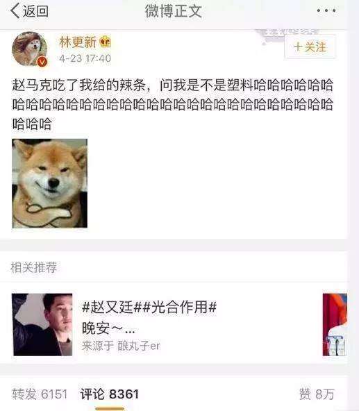 4月23日,林更新发微博分享了自己给好友赵又廷吃了辣条后的搞笑一幕,林更新笑得不能自已,可能他也没想到赵又廷长这么大竟然都没有吃过辣条吧。赵又廷吃了林更新给他的辣条后,问的第一句话是:是不是塑料。