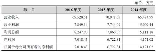 招股书中显示,菲林格尔2014-2016年营业收入分别为:6.55亿元、7.1亿元、6.95亿元,同期利润分别为:0.5亿元、0.77亿元、0.78亿元。