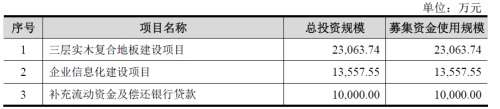 所募资金将用于三层实木复合地板建设项目、企业信息化建设项目、补充流动资金及偿还银行贷款。