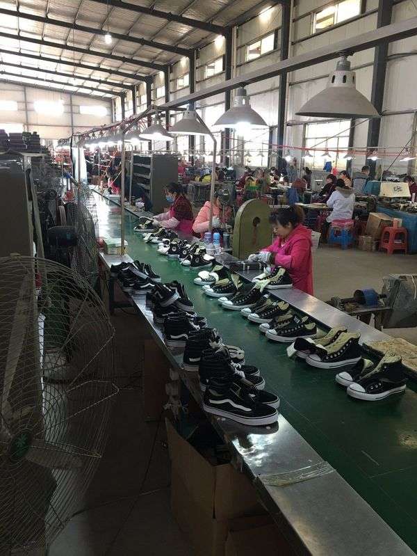 生产车间面积上千平方米,里面气味刺鼻,数台电风扇正呼呼转动,100多名工人十分忙碌:制作鞋底、印花、缝制鞋面、做鞋帮、固定鞋型、系鞋带、装盒……