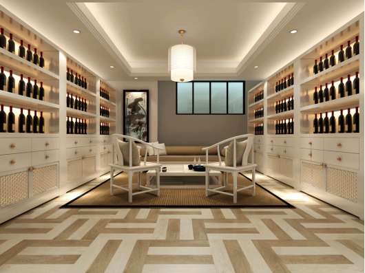 灰白相间的地板以独特的方式组拼,搭配优雅的新中式风格,将酒窖装扮得如同微醺的淑女,别有一番韵味。