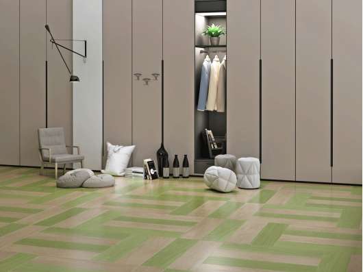 地板以充满生机的绿色与木色组合,二者相互交织,使明媚的色彩成为整个家居空间的基调,让家在温暖中充满生机和希望。