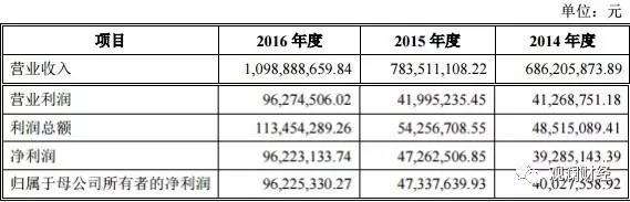 根据金牌厨柜的招股说明书显示,金牌厨柜2014-2016年营收分别为6.86亿元、7.84亿元和11.00亿元,2016年营业收入同比增长40.25%,2014-2016年归属母公司股东的净利润分别为4003万元、4734万元和9623万元,2016年归属母公司股东的净利润同比增长103.27%。