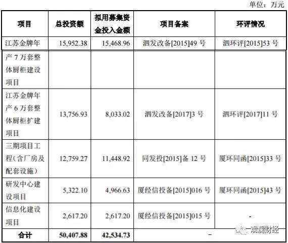 根据金牌厨柜的招股说明书显示,此次募得的资金将用于江苏金牌整体厨柜扩建项目,厂房、研发中心及信息化建设项目。