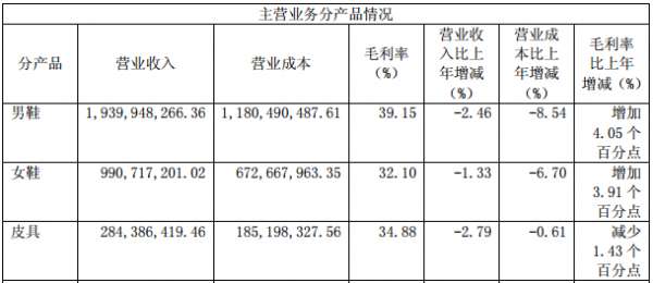 而在业务方面,奥康鞋业在男鞋、女鞋和皮具在营业收入上同比上年分别下降了2.46%、1.33%、2.79%。